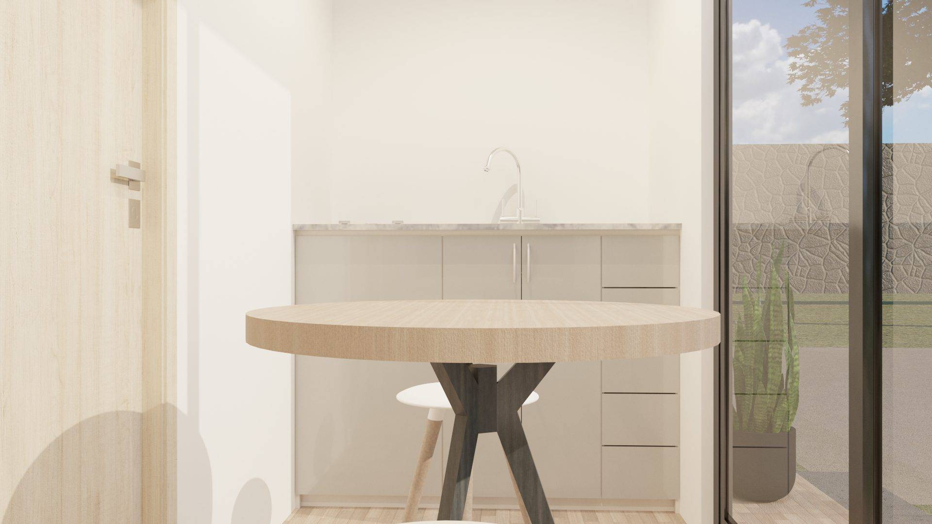 La casa KR5 A contiene: 1 Habitaciones, 1 baño, 1 cocina, un espacio flexible para comedor sala y sitio de trabajo, todo esto en 17 m2 construidos. 6,8 m X 2.5 m